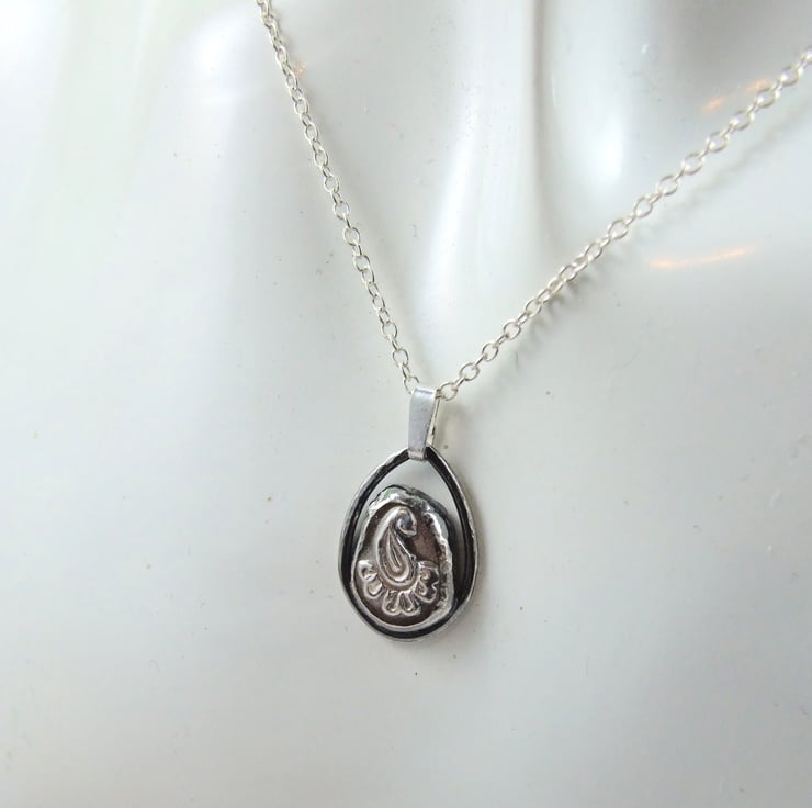 I have created the silver nugget from recycled silver heated to melting point when it forms a natural pebble shape, then once cooled I have hammered it into a steel die to emboss the peacock pattern on. I then created a wire outline to form the bail and soldered in place, this is a solid silver pendant so has a lovely weight to it. Fitted to an 18 inch sterling silver chain.