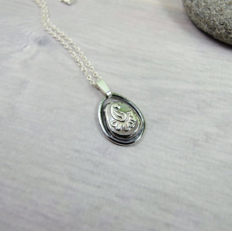 Silver pebble necklace with embossed peacock on 18 inch sterling silver chain.