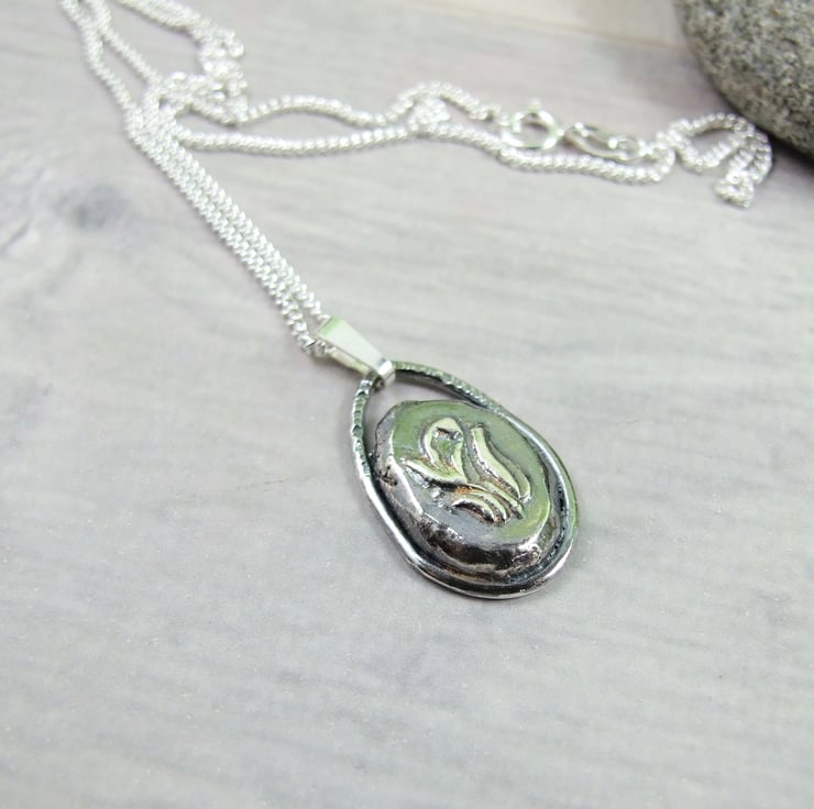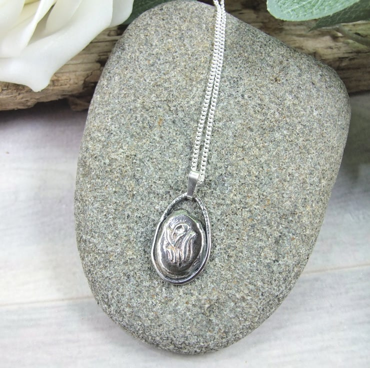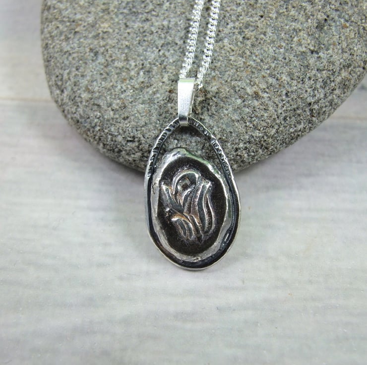 Silver Pebble Pendant with Embossed Flower Bud, Recycled Silver Necklace