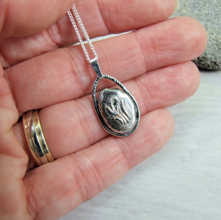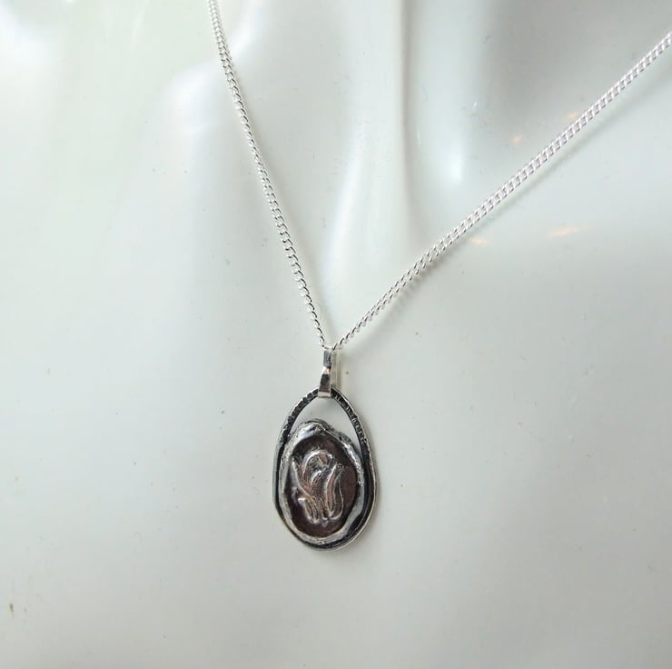 I have created the silver nugget from recycled silver heated to melting point when it forms a natural pebble shape, then once cooled I have hammered it into a steel die to emboss the flower bud pattern on. I then created a wire outline to form the bail and soldered in place, this is a solid silver pendant so has a lovely weight to it. Fitted to an 18 inch sterling silver chain.