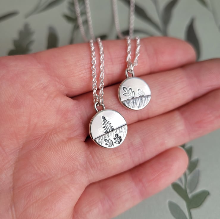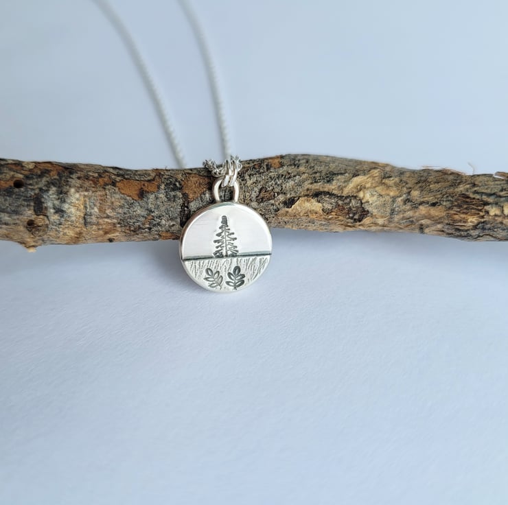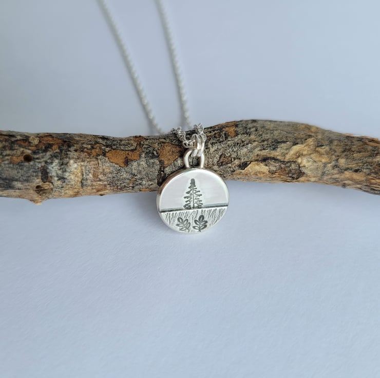 Handmade from recycled sterling silver, this circle pendant features hand stamped details of a conifer tree in the distance in front of meadow field with young leaf shoots swaying in the breeze. The stamped details have been oxidised.