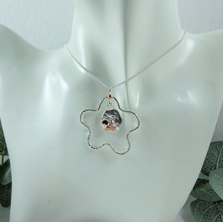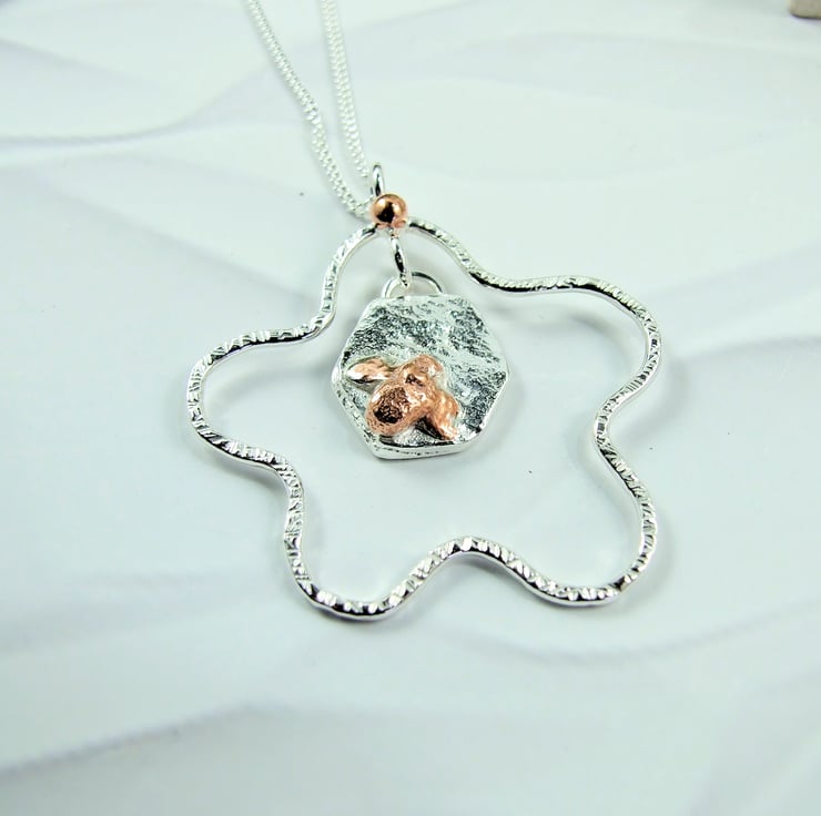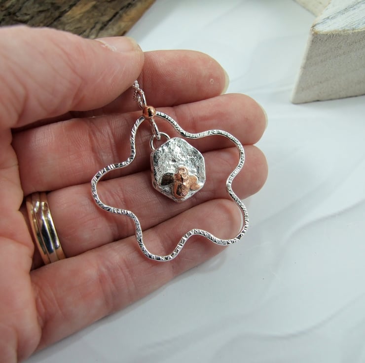 I have created the flower base from 1.5 mm thick silver wire, formed by hand into a flower shape. Nestled inside is a honeycombe cast in recycled silver int my ow hand carved carbon mould. The little bee has been sculpted by hand from copper clay and kiln fired then soldered in place. The pendant is all free form making this a totally unique piece. Fitted to an 18 inch recycled .925 Sterling Silver chain.