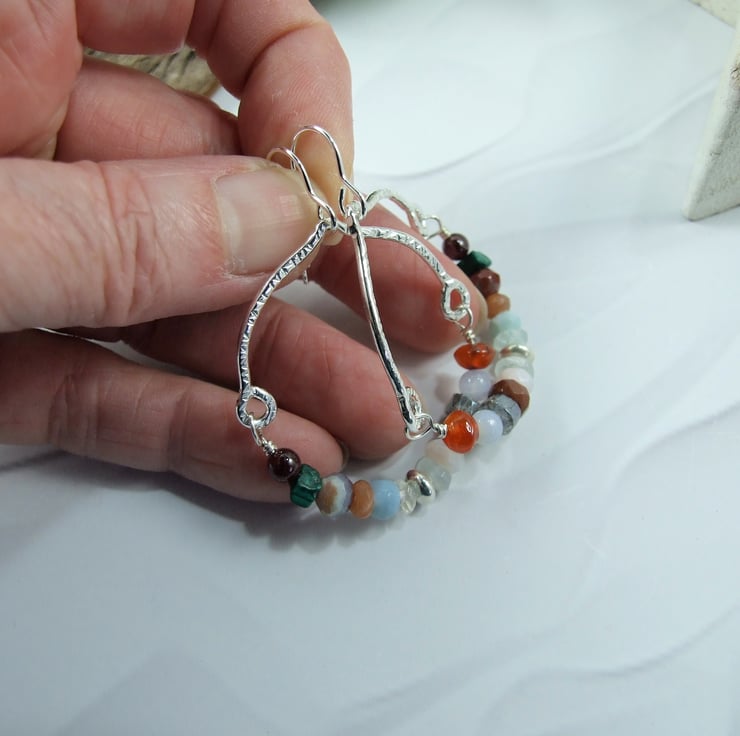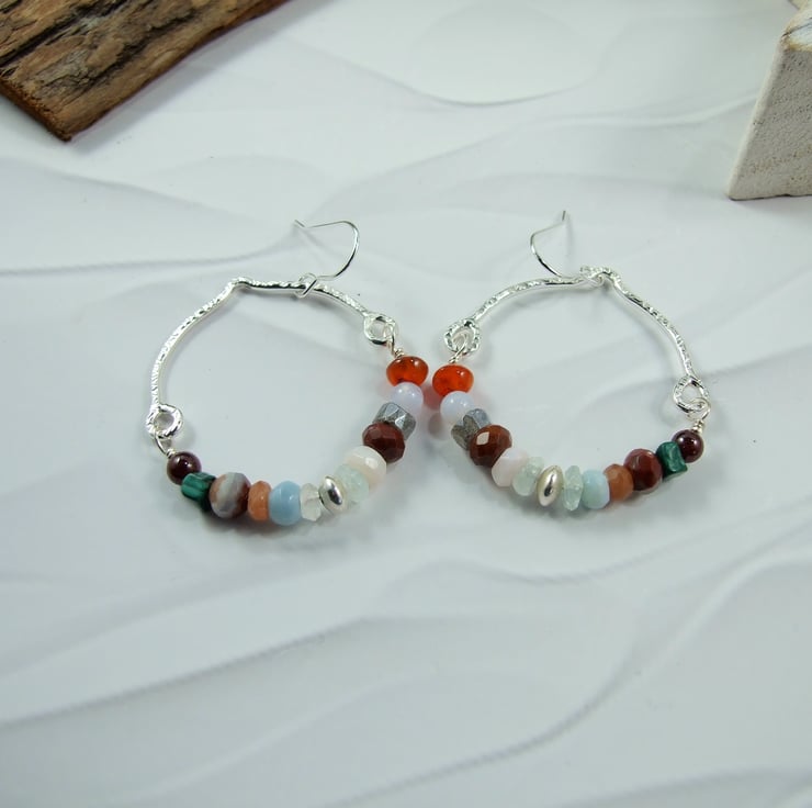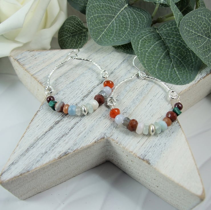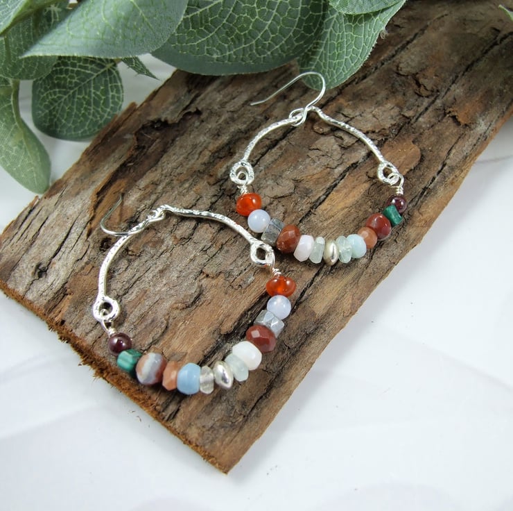 I have created the top part of the hoop using recycled sterling silver wire, curved and shaped by hand. The bottom half of the hoops are made up of mixed gemstone beads including carnelian, agate, jasper, labradorite, morganite, opal and sunstone annd securely wire wrapped in place but allowing movement. Fitted to sterling silver ear wires.