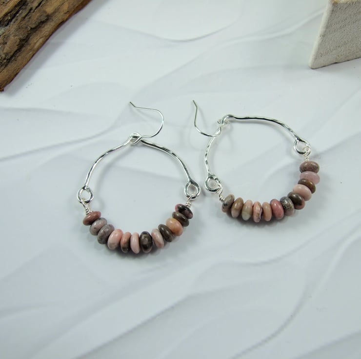 I have created the top part of the hoop using recycled sterling silver wire, curved and shaped by hand. The bottom of the hoops are made up pretty pink rhodonite rondelle gemstone beads securely wire wrapped in place but allowing movement. Fitted to sterling silver ear wires.