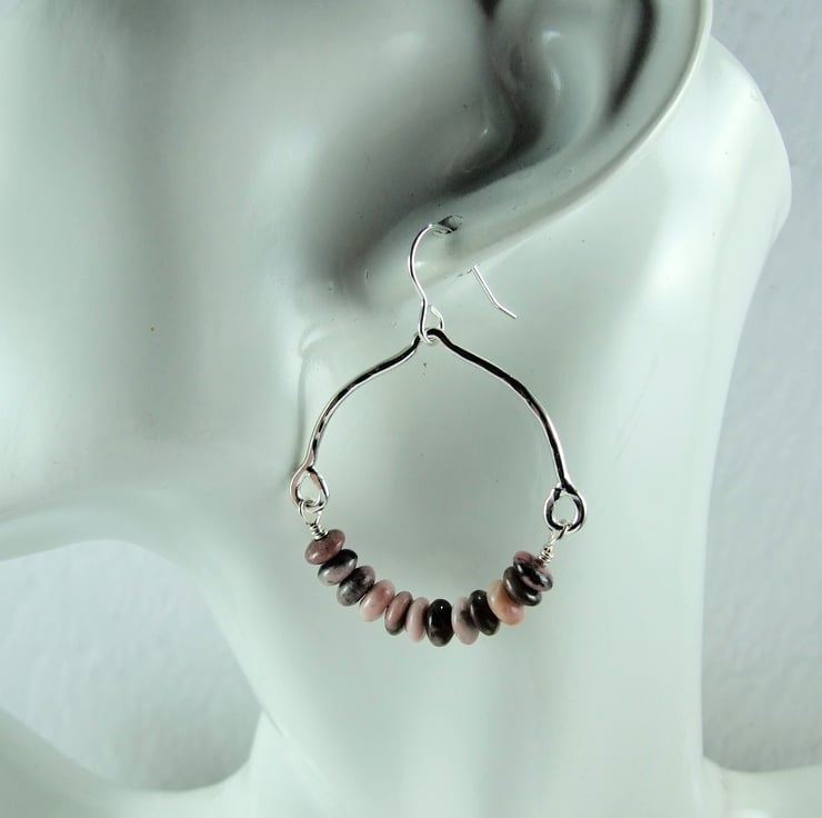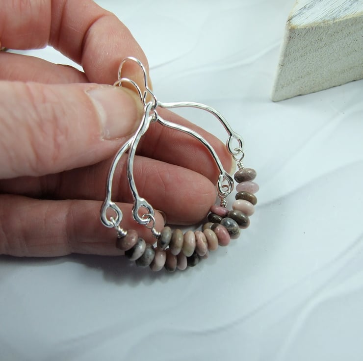Sterling Silver and pink Rhodonite gemstone large hoop earrings.