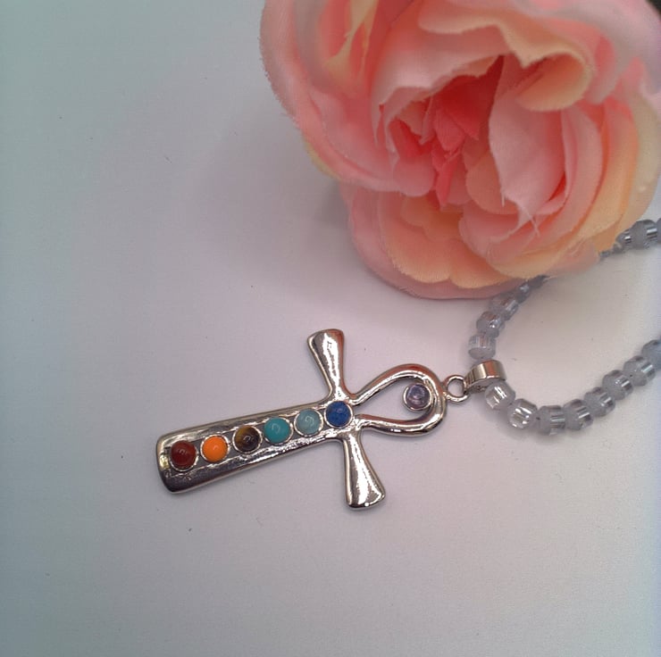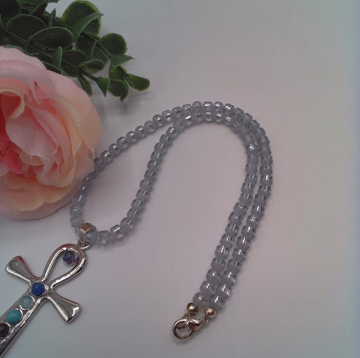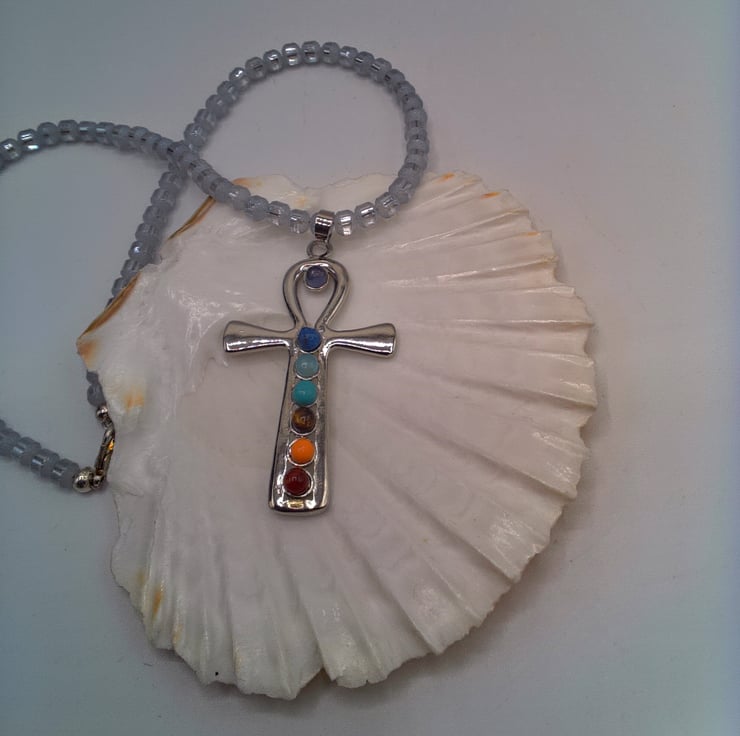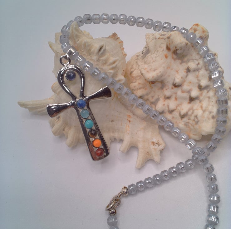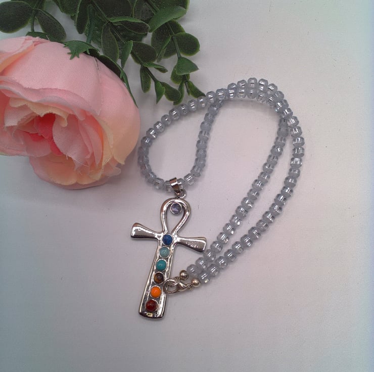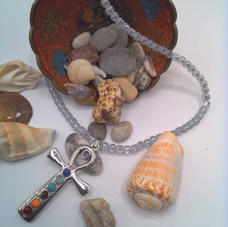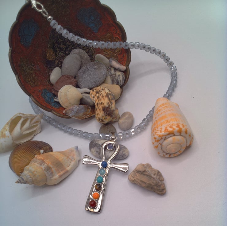 A beautiful silver plated Chakra Celtic Cross pendant with semi precious stones on a pale blue beaded choker necklace. It would look great with any outfit for a party or trip out, or to wear for an evening out. The necklace would make a lovely gift for a fun loving lady for a birthday or anniversary, or a treat for yourself. The necklace is made using pretty blue/grey 5 mm drum shaped glass beads with a silver band around the middle. The semi precious stones used in the Celtic cross are, Garnet, Aquamarine, Lapis Lazuli, Amethyst, Tiger's Eye, Green Aventurine and Carnelian. The pendant is 55 mm x 35 mm and each of the semi precious stones is 5 mm in diameter. It is suspended from a silver plated bail and the necklace has a silver plated lobster clasp. The overall length is 14.5 inches (37 cm). The pendant will be dispatched wrapped in tissue paper in an organza bag and be delivered to you via Royal Mail first class post.