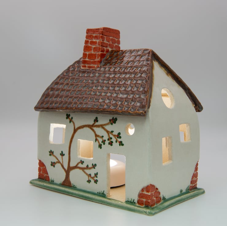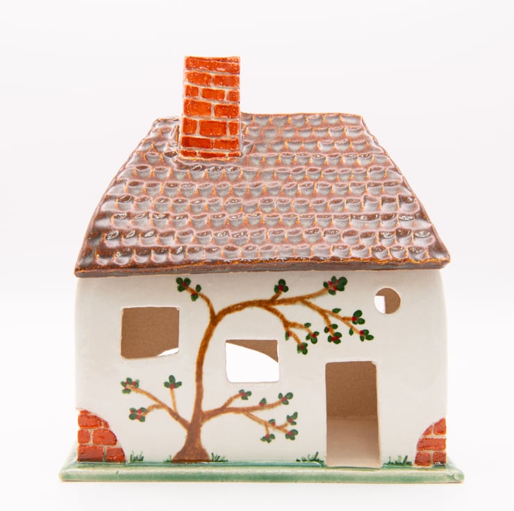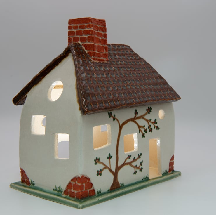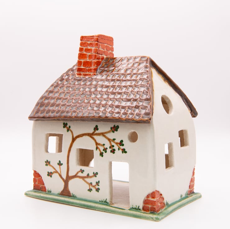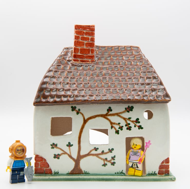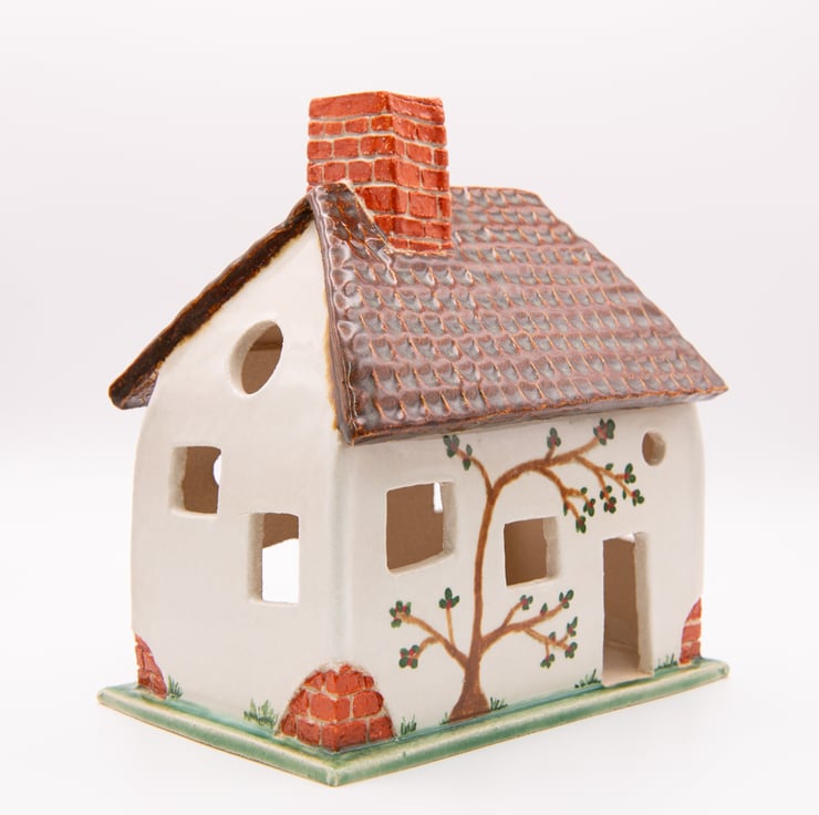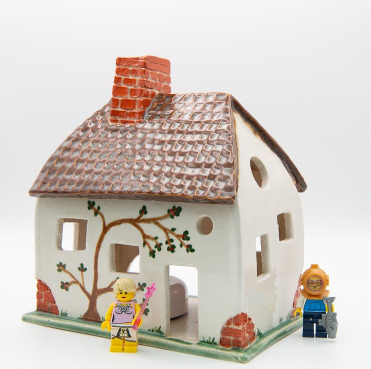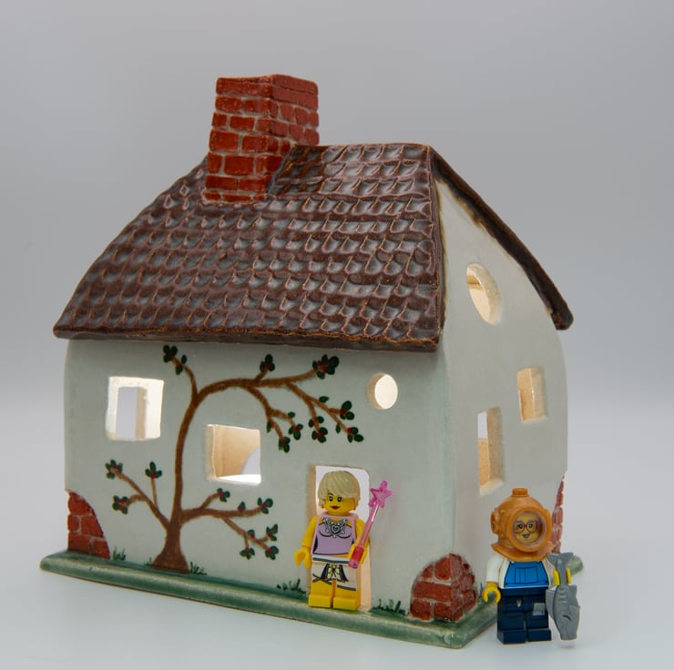 A tumble-down cottage, handbuilt from carved and shaped slabs of stoneware clay.