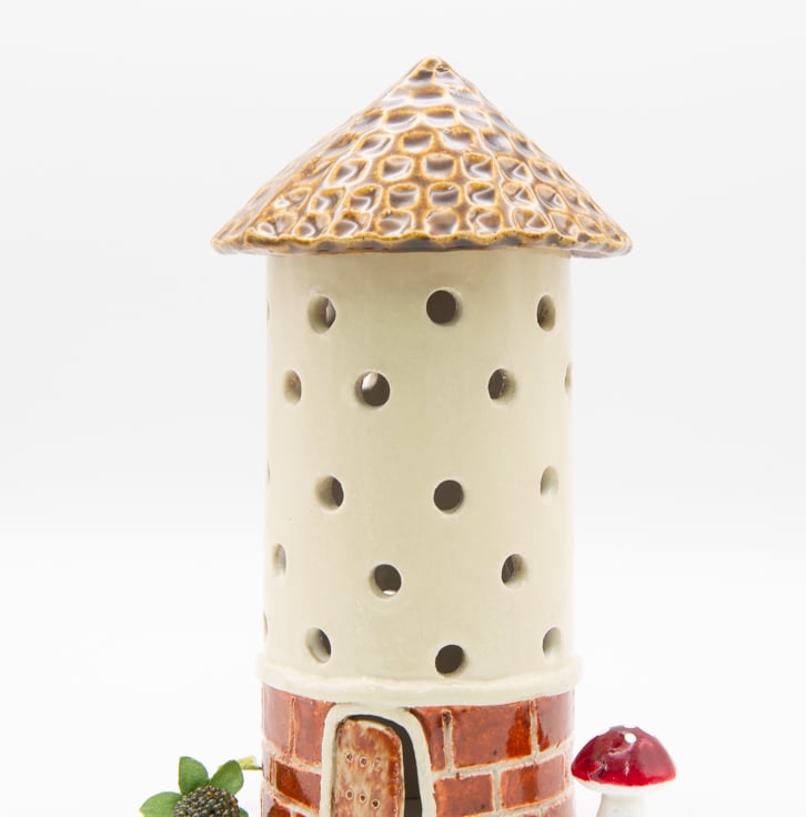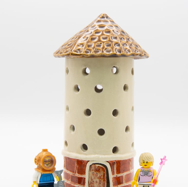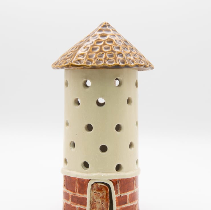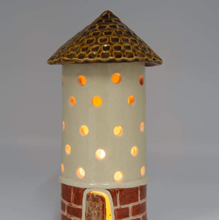 Tower shaped night light, handbuilt from carved and shaped slabs of stoneware clay.