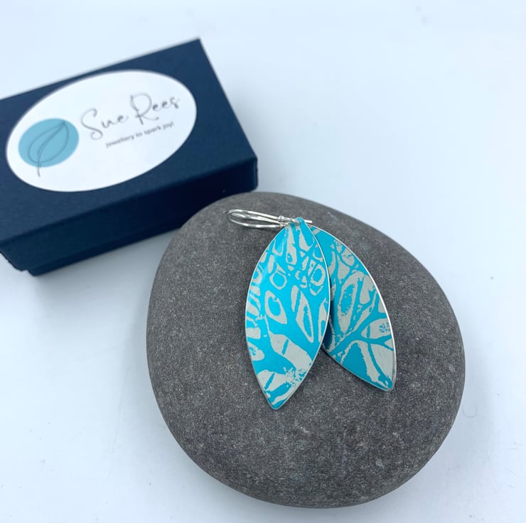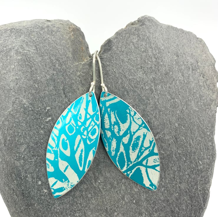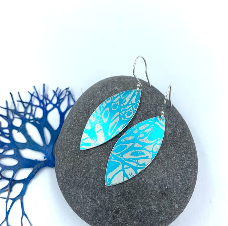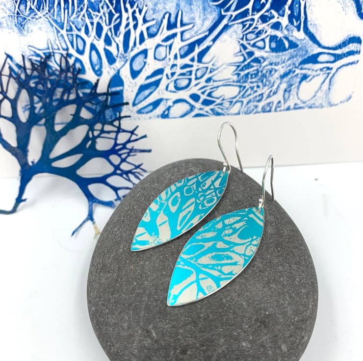 These stunning earrings are truly unique! I printed the pressed seaweed onto paper, then laser etched the design onto hand painted anodised aluminium. They hang from handmade sterling silver hooks.