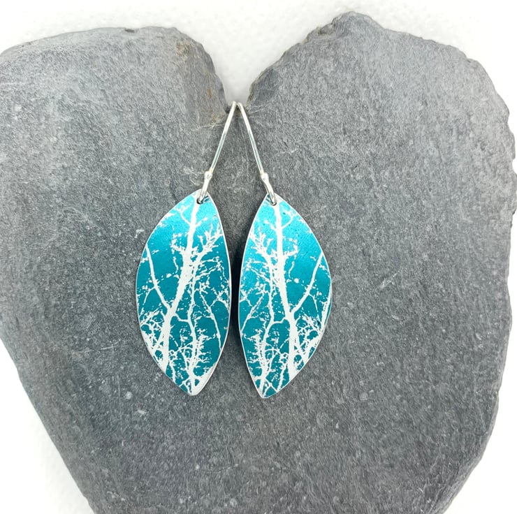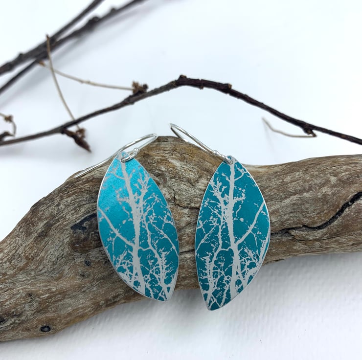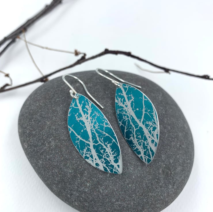 These lovely lightweight earrings are from my ‘Winter Trees’ collection. The offset oval shape has been dyed dark teal and domed.