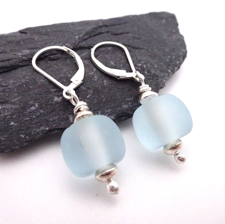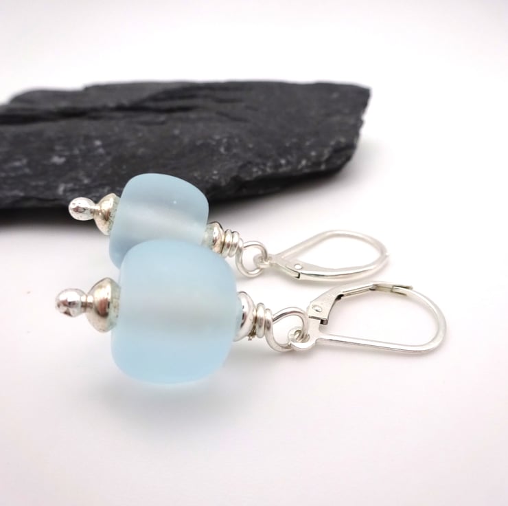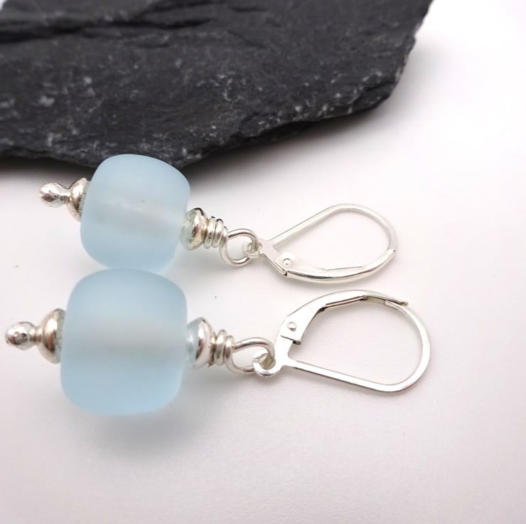 They feature handmade lampwork light blue glass beads strung onto sterling silver lever back ear wires.