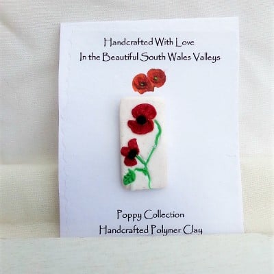 A rectangle poppy brooch that I have handcrafted from polymer clay.