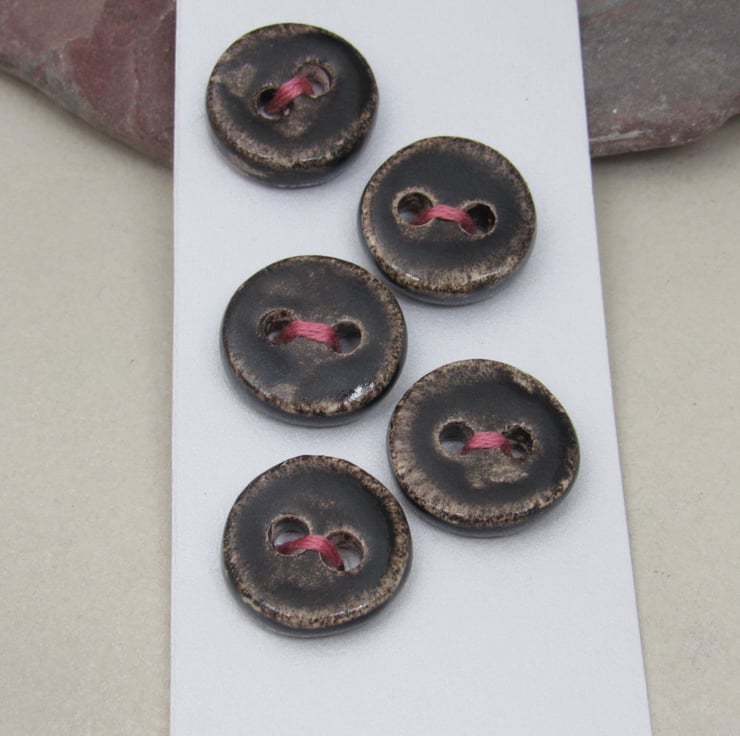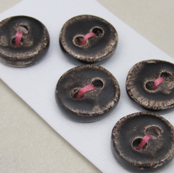 5 small stoneware buttons finished with a dark brown semi-gloss glaze