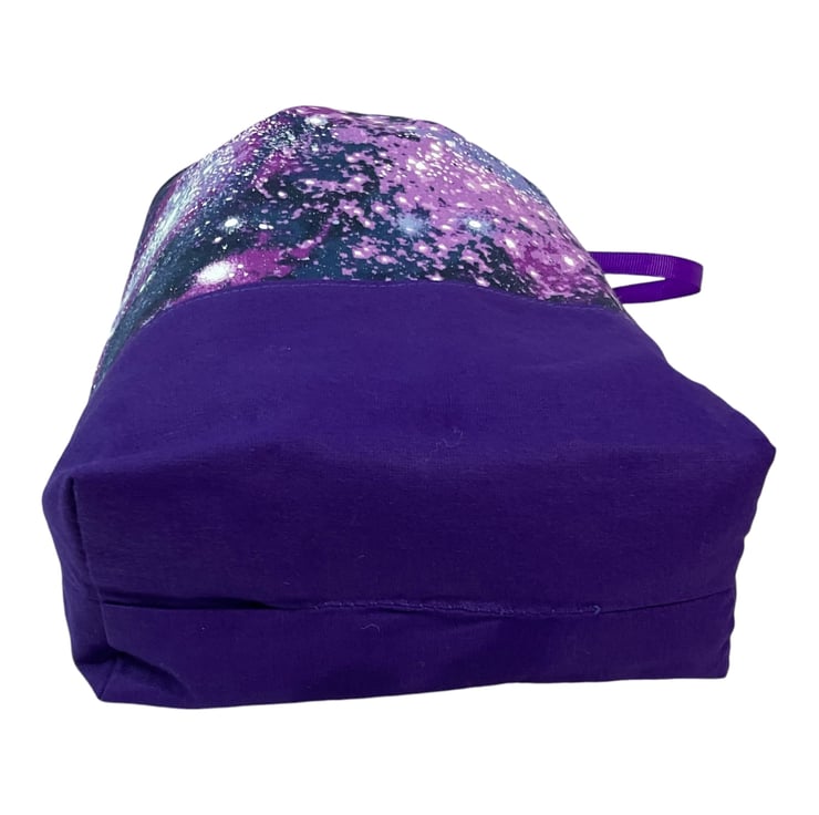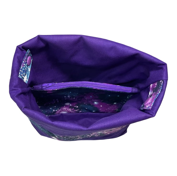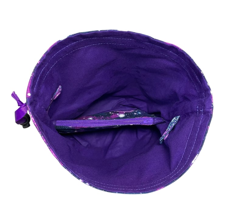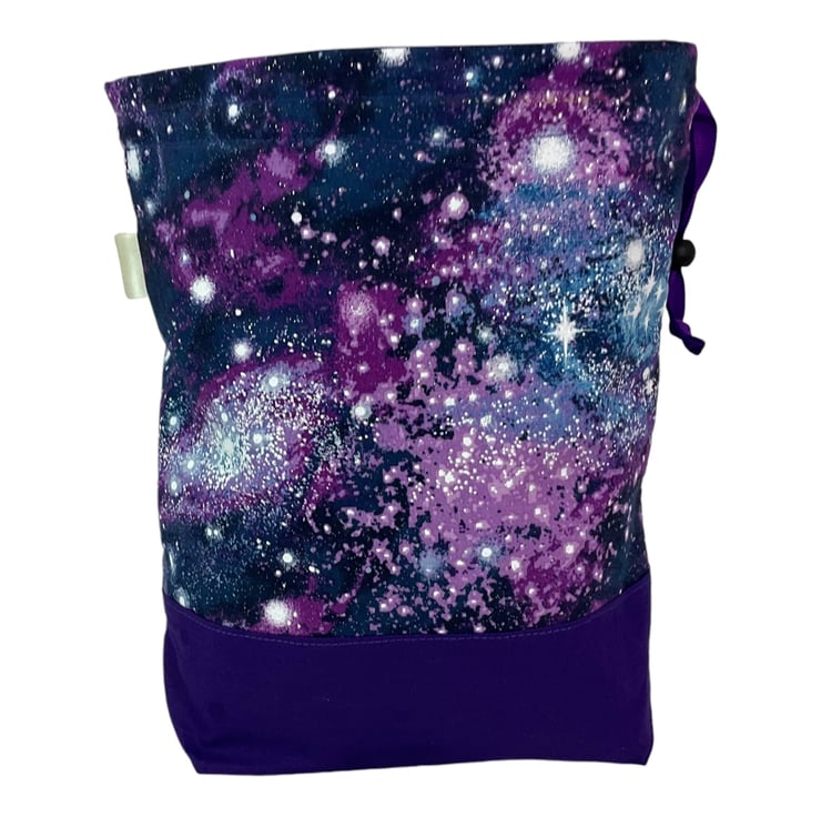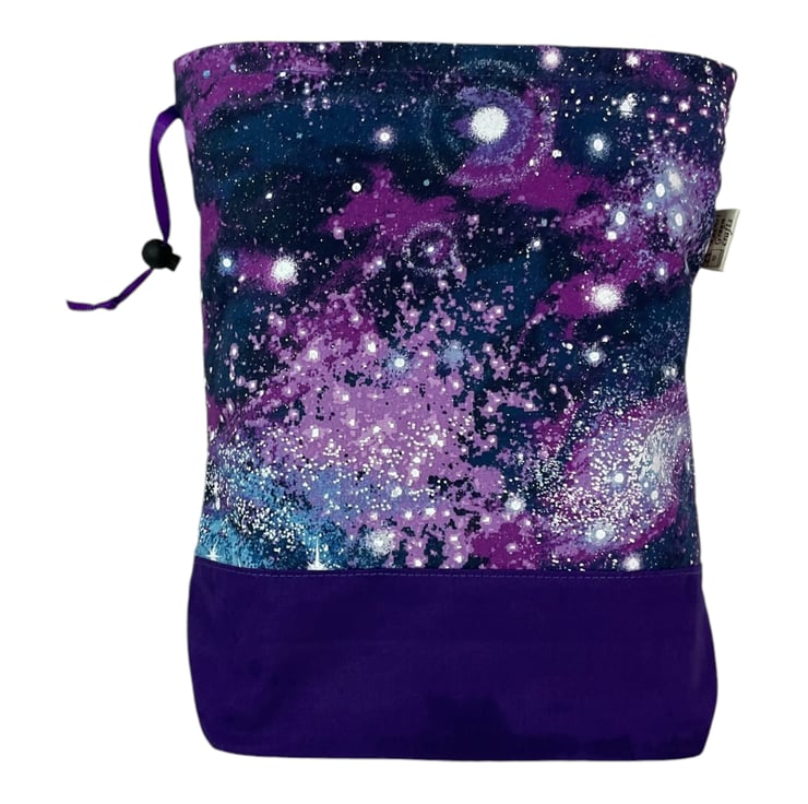 This is a two at a time knitting bag, but it also could be used for other things. It has the loveliest space, stars, astronomy print cotton on a navy background and I have paired it with a ldeep Purple cotton lining and exterior accent piece. The divider inside the bag is a fixed zip pouch that has the exterior and lining matching as the main bag itself. Inside are 2 fabric matched yarn guides, fastened with snaps. The entire bag is interfaced and the base boxed so it stands up.