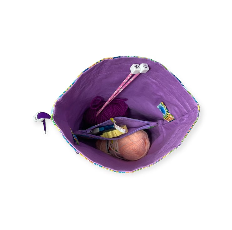 The bag can comfortably hold a couple of 50g balls each side of the divider, with lots of space above for your WIP. Shown filled using an alternative but identical set up bag. This bag and contents not included.