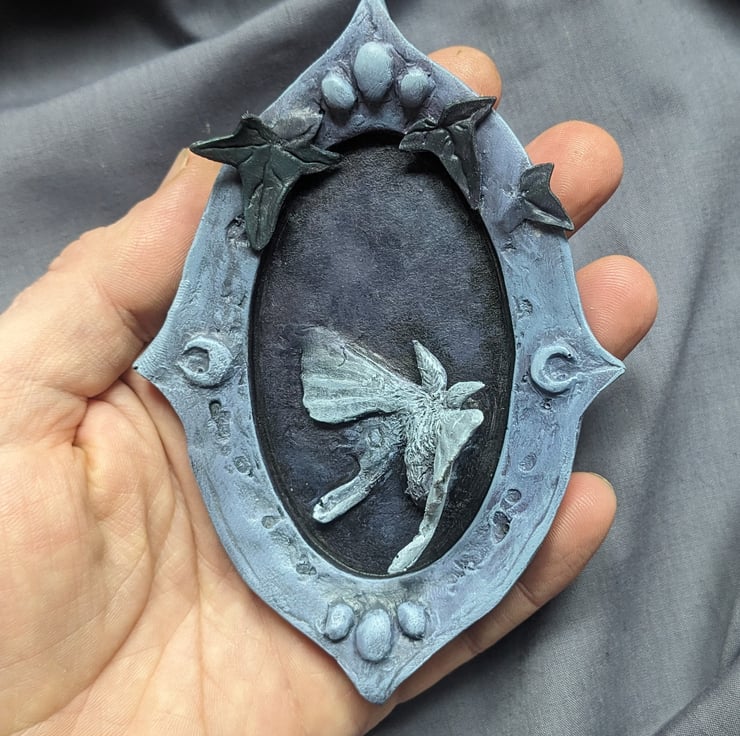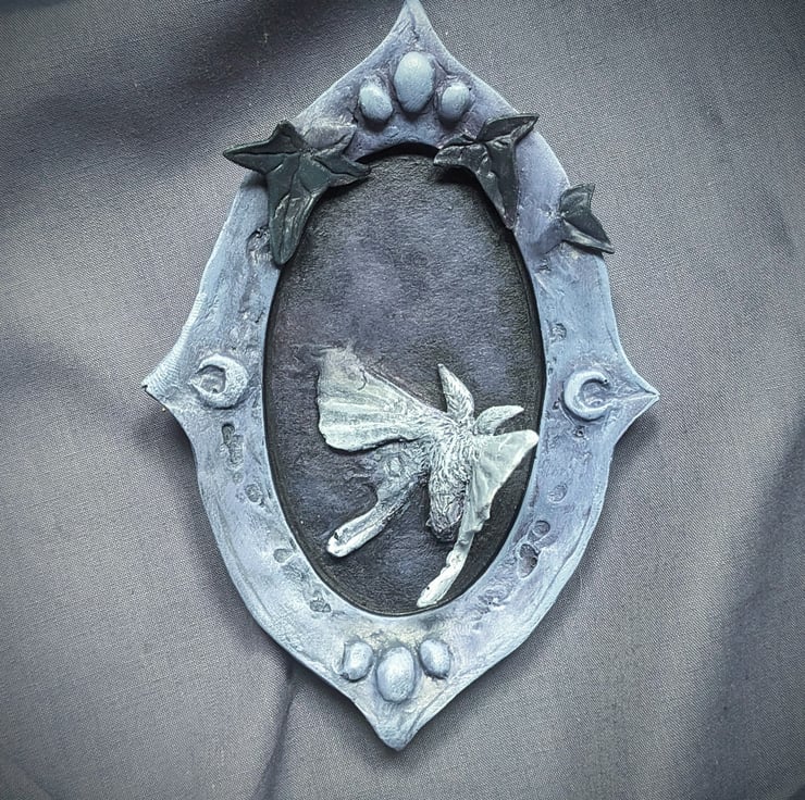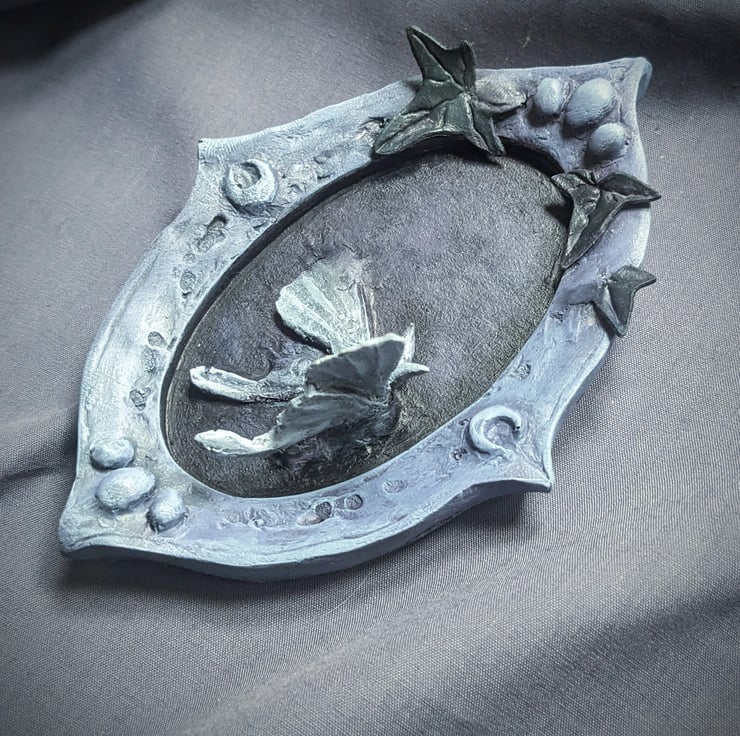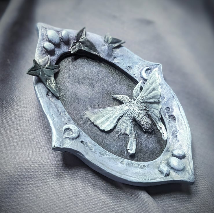 The symbolism of mirrors is an interesting idea to play with, although it doesn't have an actual mirror plate in, the surface of the mirror is meant to offer up the idea that mirrors are gateways to an unseen world. With in the Pale House they are small doorways where moths, ivy and flowers burst forth, bathed in a gentle glow, akin to moon light.