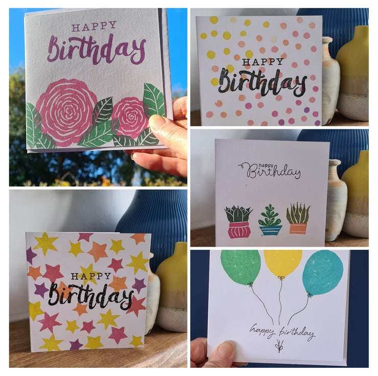 This is a set of five cards which are all handprinted from my own carved rubber stamps. I use quality ink stamp pads to create lovely colourful designs. This multipack offers great value over buying the cards individually, though they are available invidiually if required.