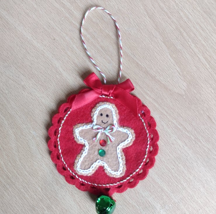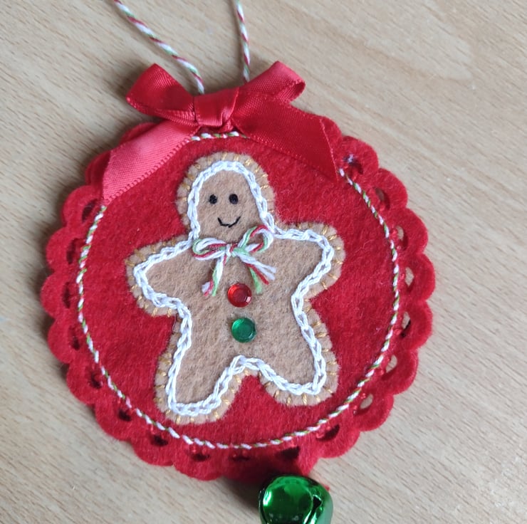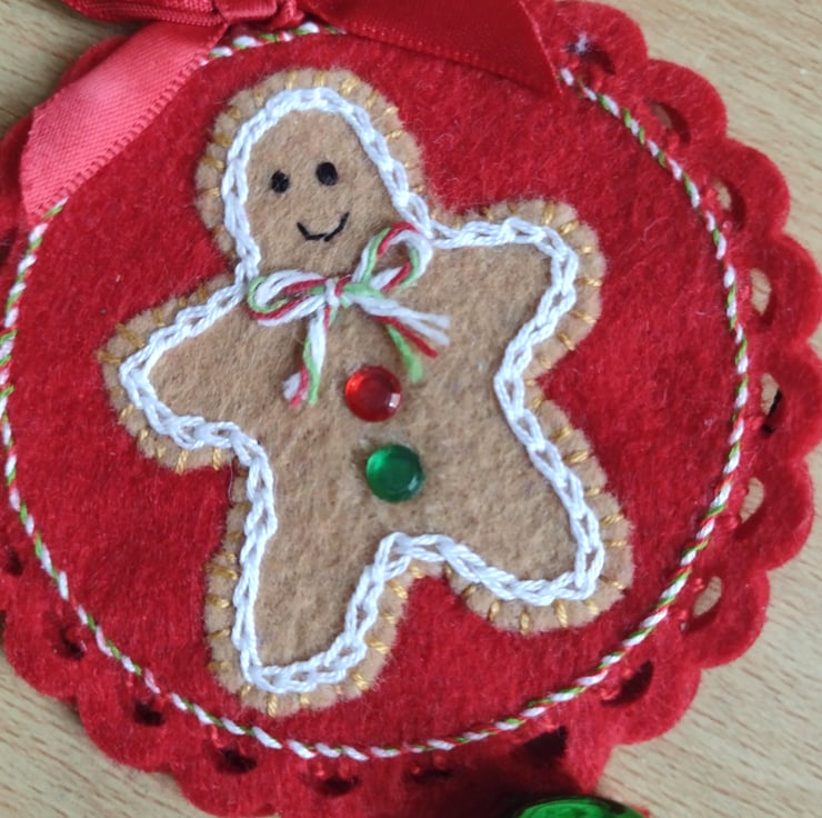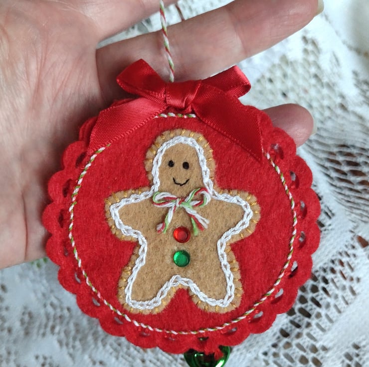 The little gingerbread man has embroidered chain stitch icing, string bow, red and green plastic gem buttons and stitched facial features.