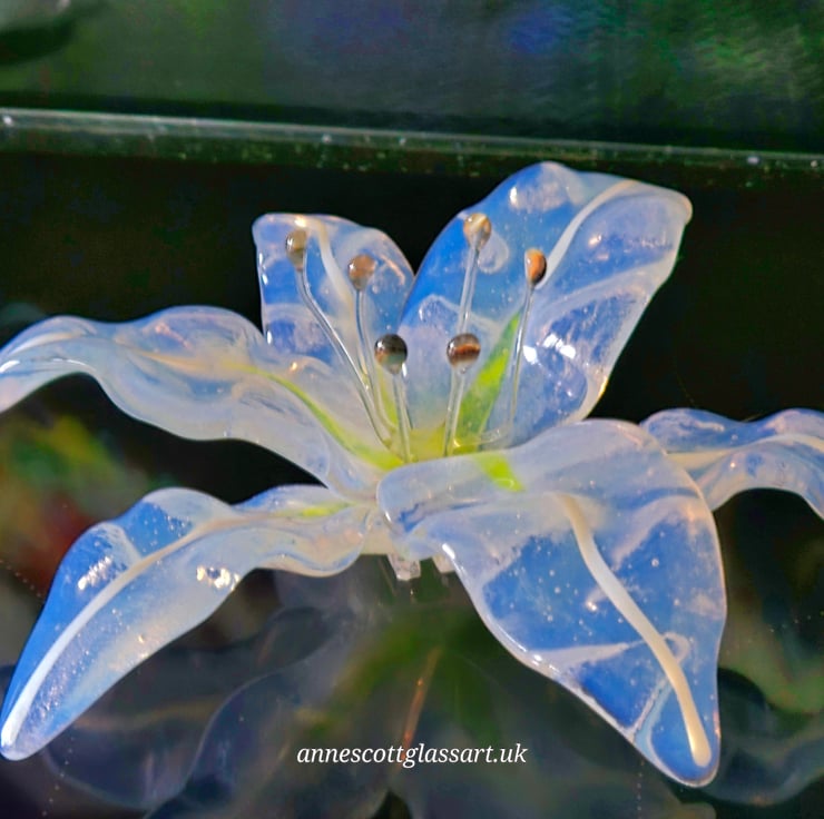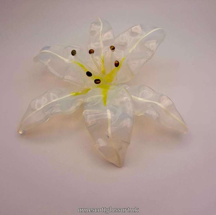 This handmade fused glass lily was one of 56 I made for my end-of-degree show for my BA(HONS) in glass at the University of Sunderland based at the National Glass Centre. Just over half of these were wafer-thin and unable to be sold due to being very fragile; the remainder were more robust. I made some of these in threes, but the finished lilies may be similar. However, they were never identical due to the nature of fused glass. But some were one-of-a-kind pieces. They were made using sheet glass, such as transparent or opaline, by hand cutting them into petal shapes, and details were added with glass powders. Due to the size of my kiln, I fired only one lily at a time. And each one took four firings to add the ail and shape. Stamens were made for each lily from glass stringers and small transparent glass pieces. Each one assembled and then slumped into shape. These were then glued into the centre for added detail. Then, each has a wall mount fitting glued to the back for displaying on a wall. Each lily measures approximately 25cm x25cm x 9cm and is in a handmade box for easy transportation and with its certificate of authenticity.