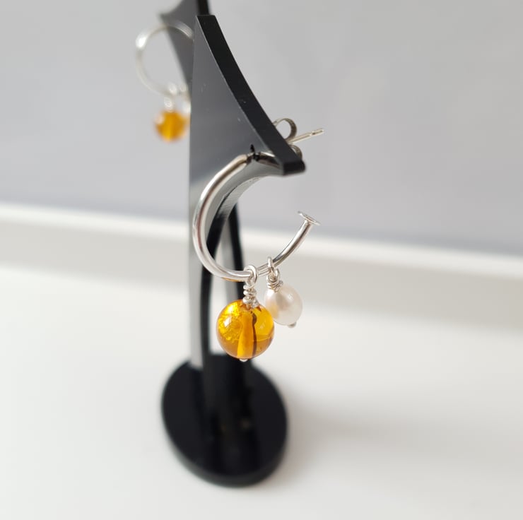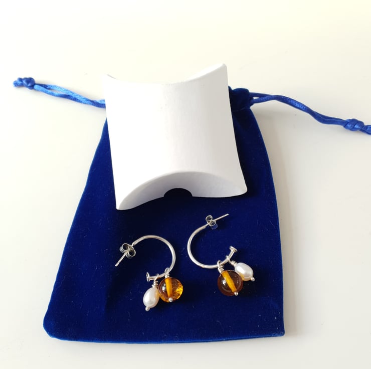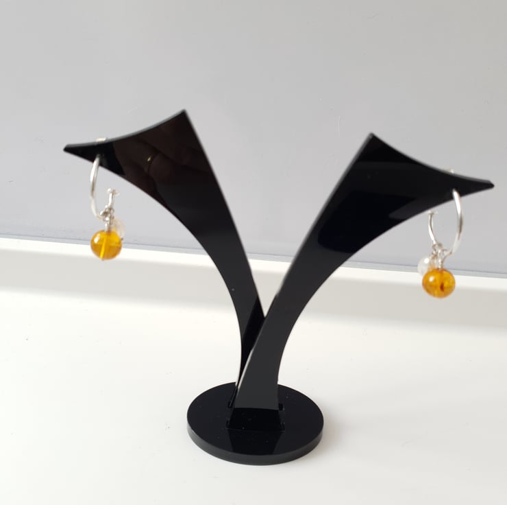 Sterling Silver wire (1.5 mm ) was used to form the basic hoops before soldering on 11 mm Sterling earring posts. Amber beads (9mm) and cultured pearls were then added to the hoops to add interest.