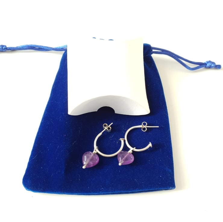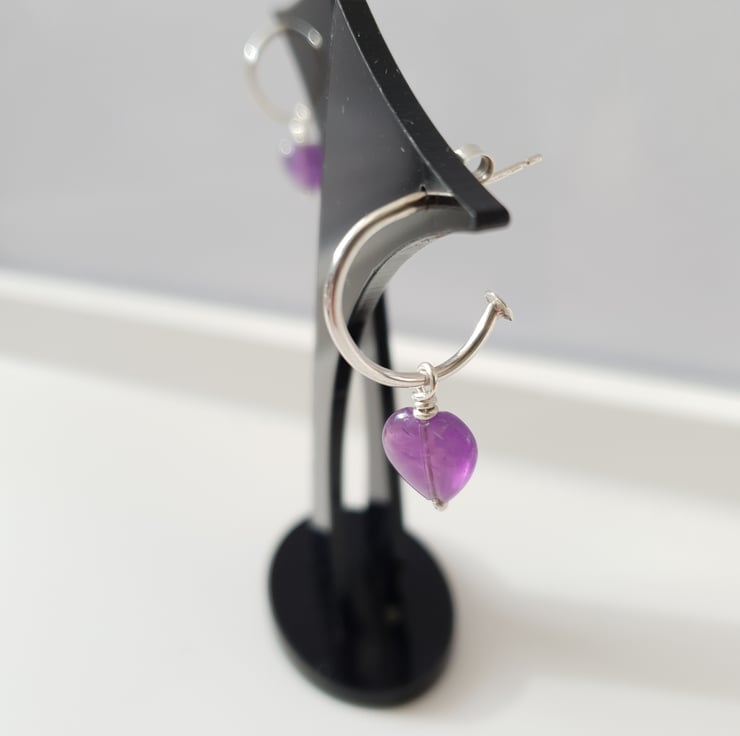 Simple Sterling silver hoop earrings with removable Amethyst heart charm.