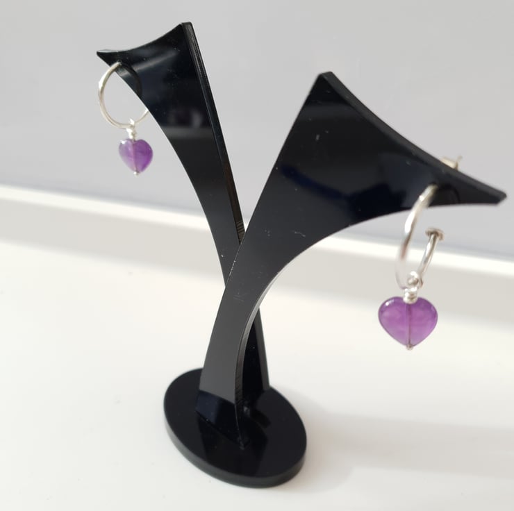 Sterling Silver wire (1.5 mm ) was used to form the basic hoops before soldering on 11 mm Sterling earring posts. Amethyst heart beads were then added to the hoops to add interest.