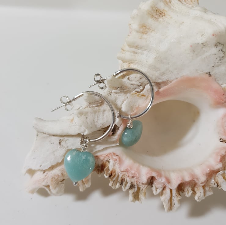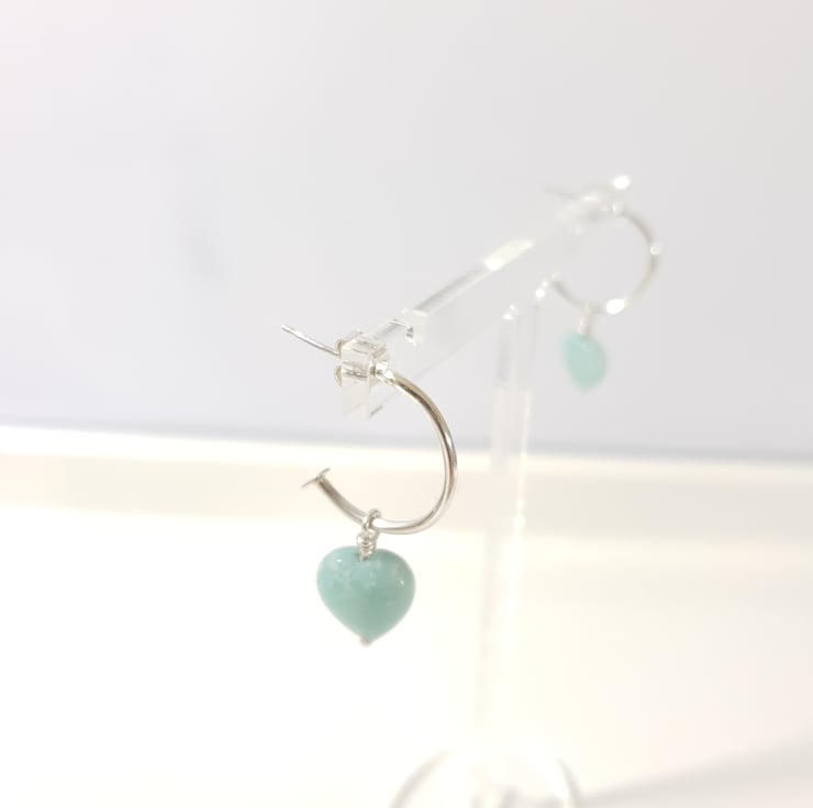 Sterling Silver Hoop Earrings Removable Aqua Amazonite Heart Charm Free UK PP