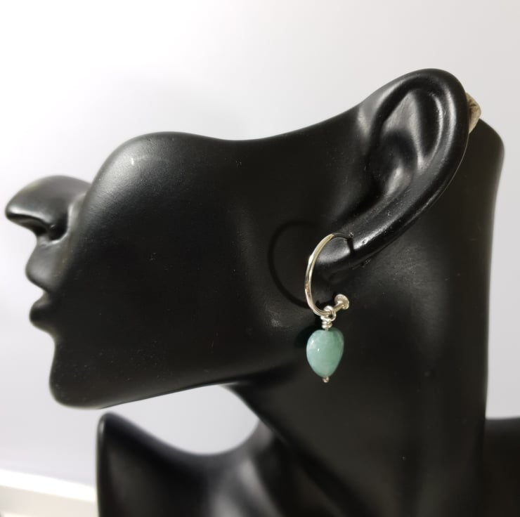 Simple Sterling silver hoop earrings with removable Amazonite heart charm.