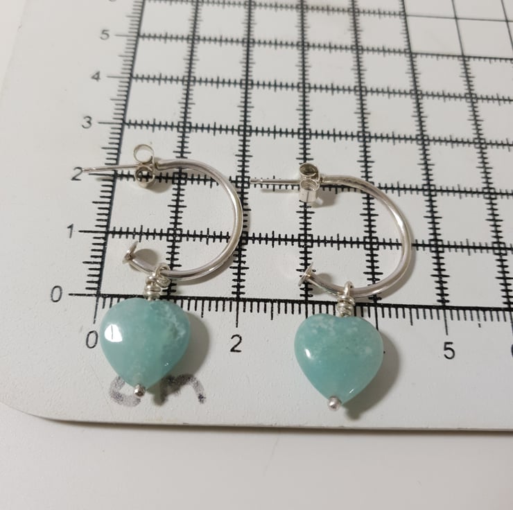Sterling Silver wire (1.5 mm ) was used to form the basic hoops before soldering on 11 mm Sterling earring posts. Amazonite heart beads were then added to the hoops to add interest.