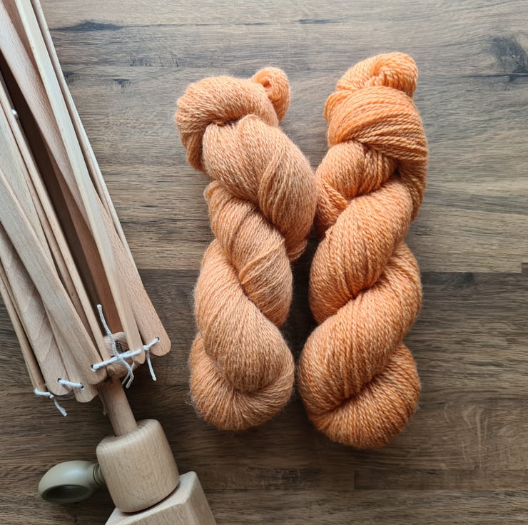 Scoured, mordanted with alum, dyed and washed with pH neutral organic detergent in my kitchen or garden.