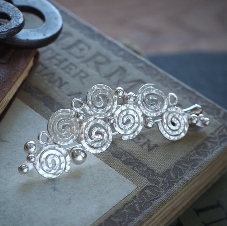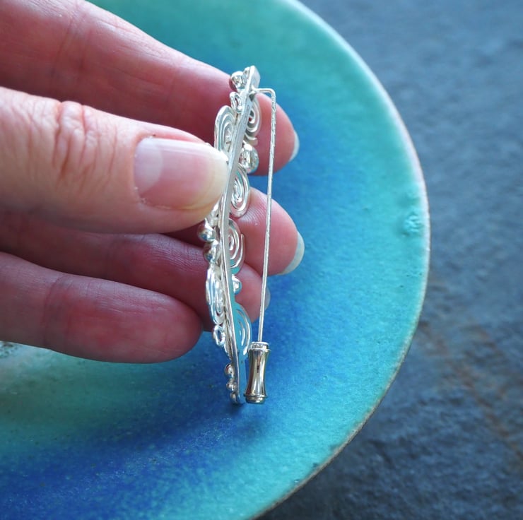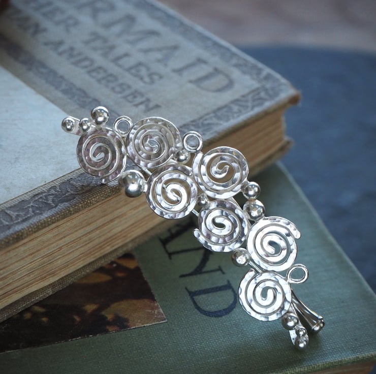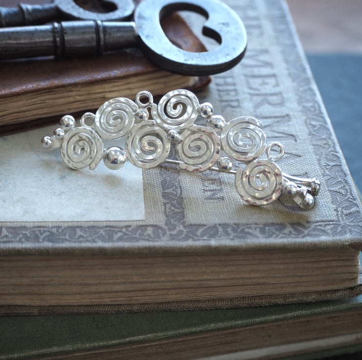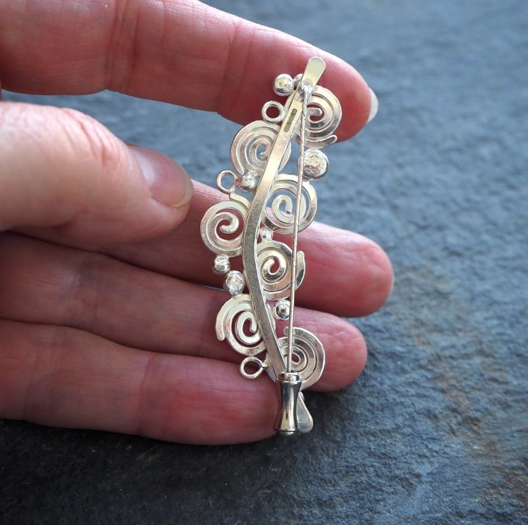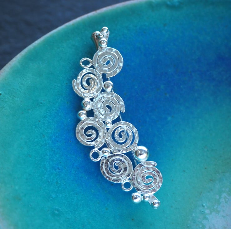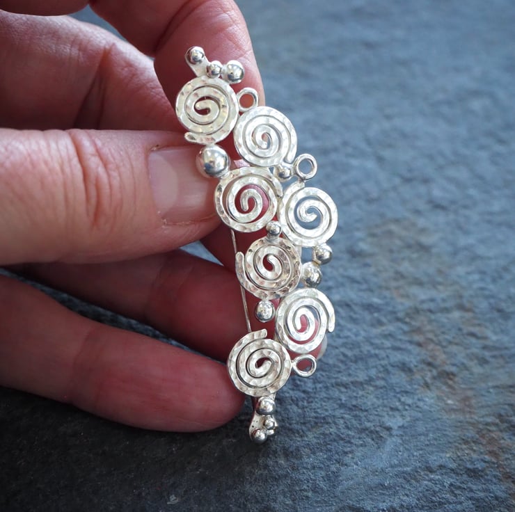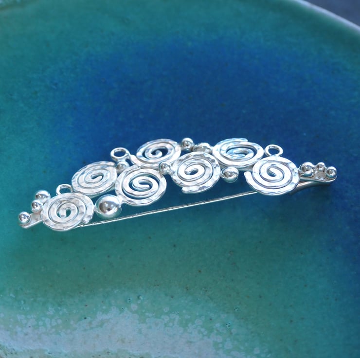 Handmade silver spiral brooch, lapel pin. Seven spirals and a scattering of silver balls and small rings were fused together to create this abstract brooch design. The silver is burnished to a bright shine to finish and has a London Assay office hallmark. The brooch attaches to the garment with a long pin. It has a sterling silver pin protector.