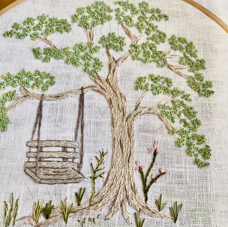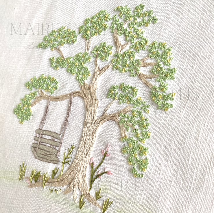 French knots are used to create the spring foliage, with a simple split stitch making up the rest of the embroidery in a range of muted green and neutral shades.