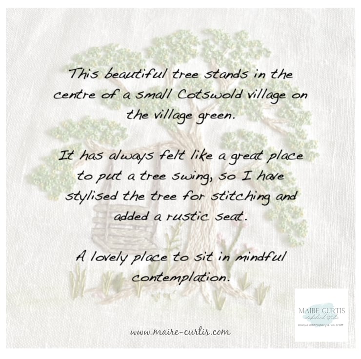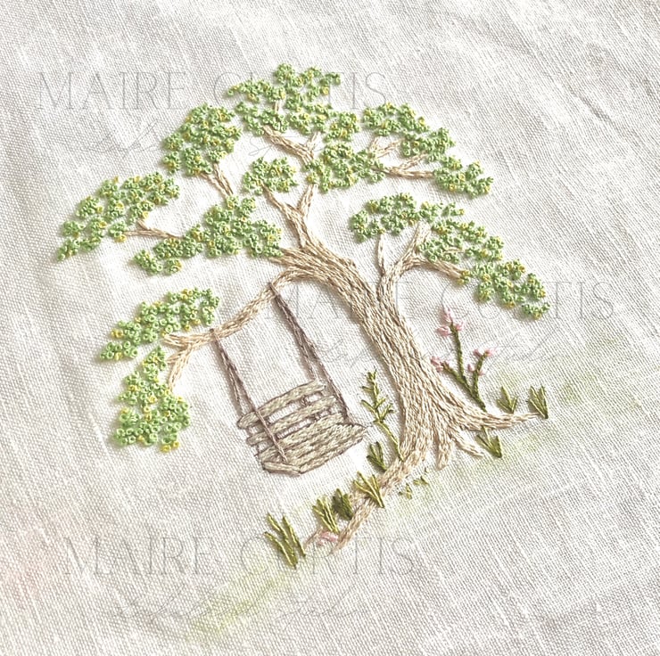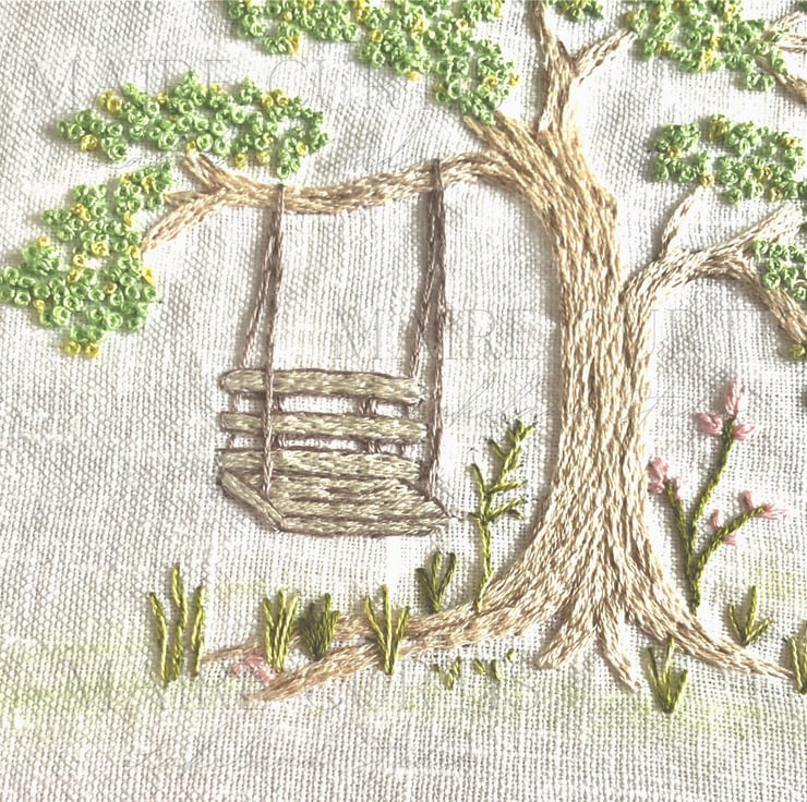 Tree swing embroidery panel, hand dyed on high quality linen fabric.