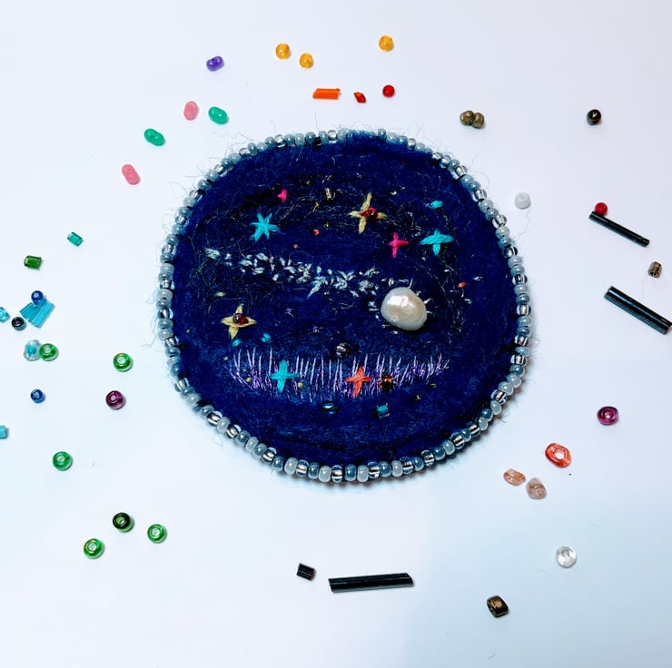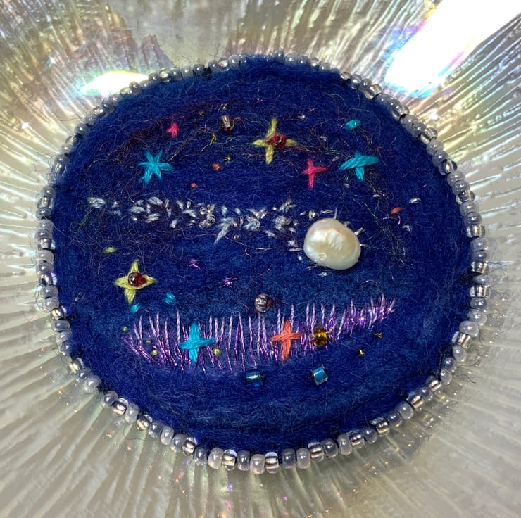 Using a needle felting technique to blend the wool and free flow embroidery to create a mini cosmic scene. The fresh water pearl represents the shooting comet. Framed with mini glass sead beads in silver glass and pearl.