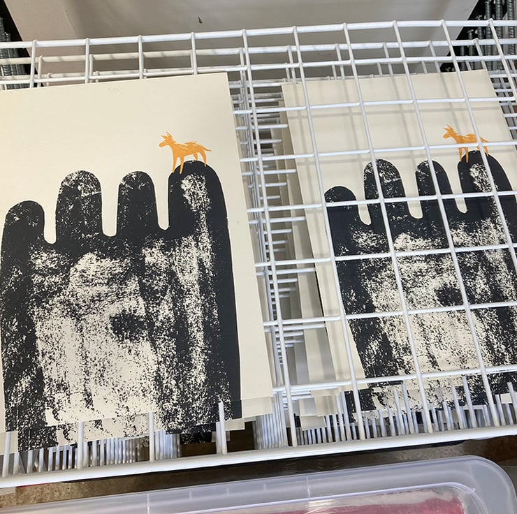 Orange and dark grey inks on Antique White Seawhite 300gsm acid-free paper. From an edition of 25, signed, titled and numbered.
