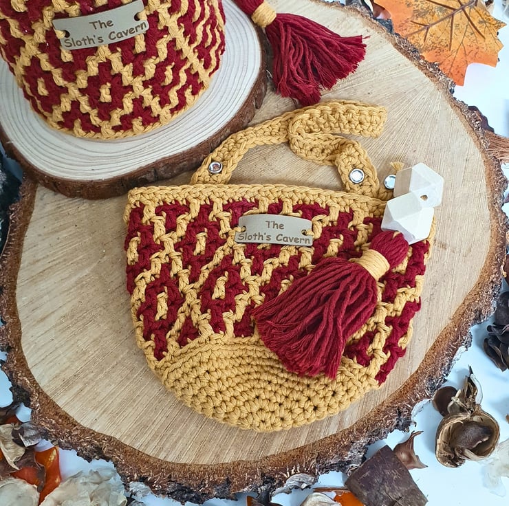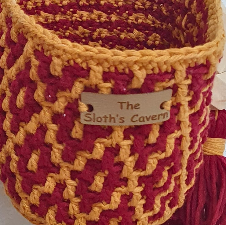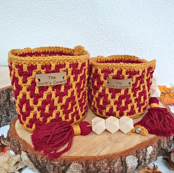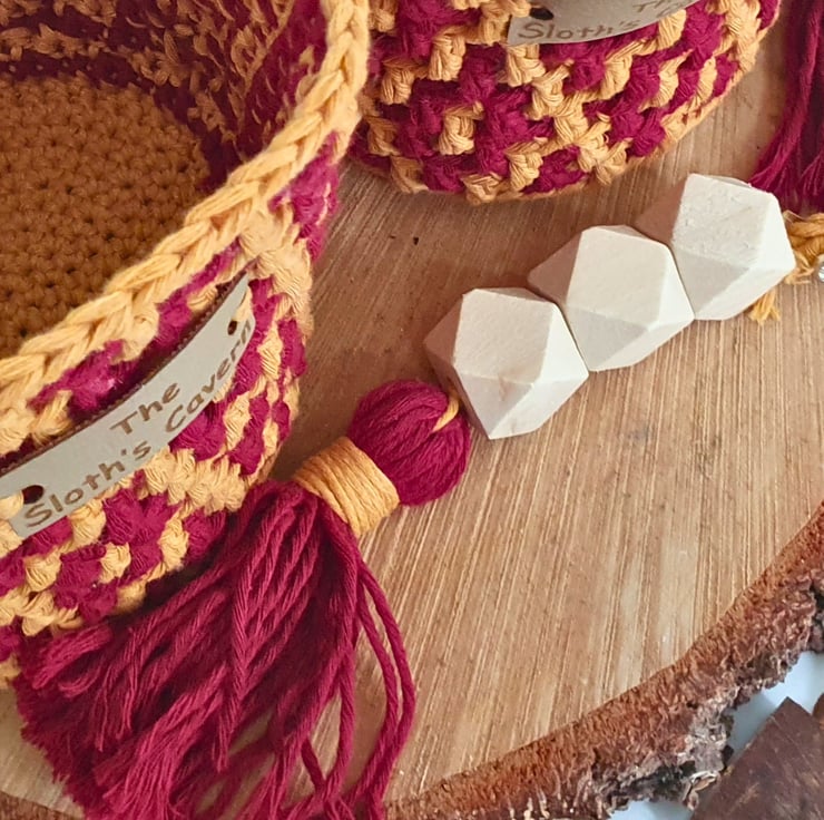 Available in small & large. Both made with 80% cotton yarn in Mustard & Burgundy. Both baskets are finished with a hanging loop attached with gem split pins & a detachable tassel with large geometric wooden beads. A faux leather tag with my shop's name is attached on both baskets.