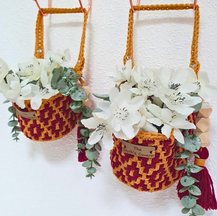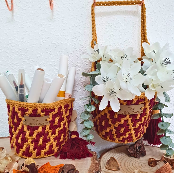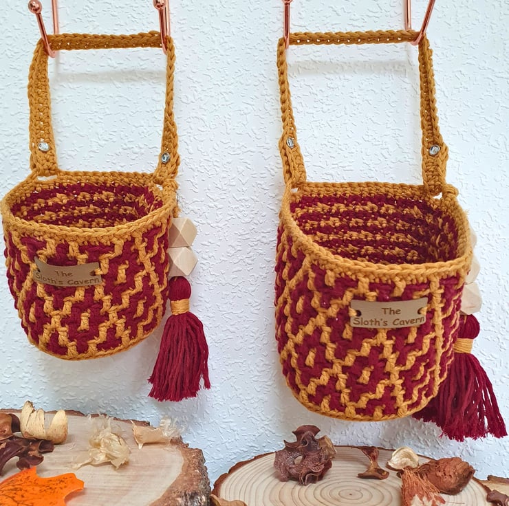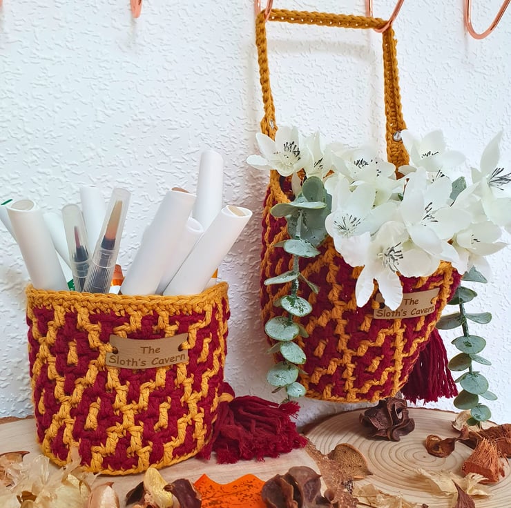 Two hanging baskets, handmade with the mosaic crochet technique. Perfect for hanging on your wall and fill with artificial flowers, air plants & small flower pots, on your peg board filled with your craft tools and various bits & bobs, or just place them on your furniture & decorative shelf & use them to store all your small items. A practical & modern idea for your interior decor, or as a housewarming gift.