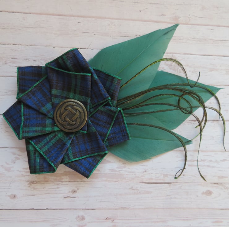 Black Watch Tartan Ruffle Celtic Button and Bottle Green Feather Hat Hair Clip