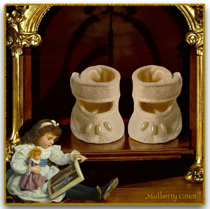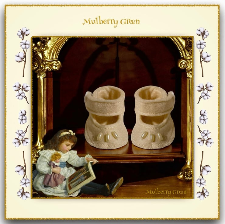 A little pair of ivory shoes, decorated with pearl beads, to fit the Mulberry Green characters. The shoes look lovely with the little heirloom dresses.