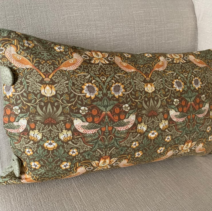 The reverse side of the cushion is made from a William Morris ‘Strawberry Thief’ cotton in a toning green/brown/gold colour scheme. At one narrow end I’ve attached a facing in the green seed fabric and added two fabric button loops and matching fabric covered buttons to close.