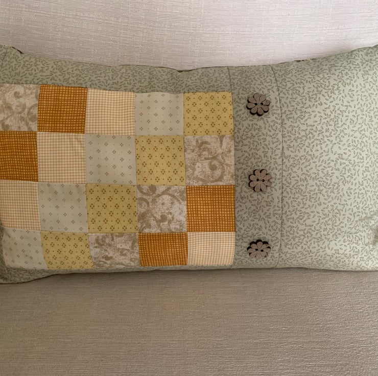 The front panel is made from 20 x 2”(5cm) squares of patchwork in shades of beige, gold and brown in a variety of prints/checks. Bands of pale green with a seed pattern have been added to the patchwork panel on all four sides plus a wider band at one end making up the rectangular shape. Three flower-shaped wood effect buttons have been added to one side band for decoration.