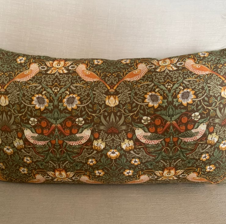 The reverse side of the cushion is made from a William Morris ‘Strawberry Thief’ cotton in a toning green/brown/gold colour scheme. At one narrow end I’ve attached a facing in the green seed fabric and added two fabric button loops and matching fabric covered buttons to close.