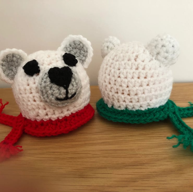 This is a pair of crochet chocolate orange covers in the shape of polar bear heads. They have a scarf and stitched on noses and eyes. Would make a great gift with a chocolate orange. Great stocking filler.