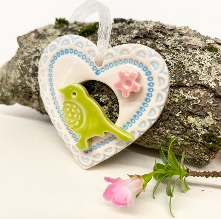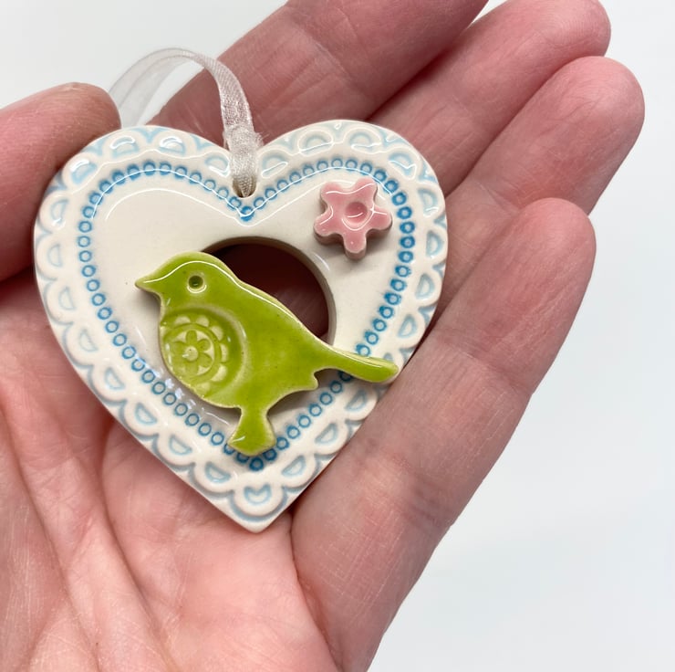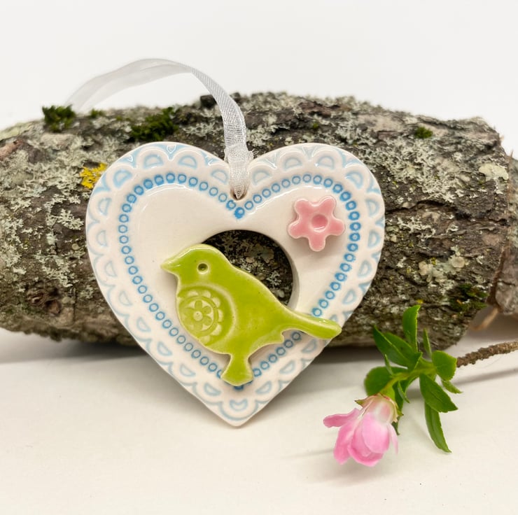 This little heart decoration is made from white earthenware clay and finshed with a little pottery bird. It has been fired twice and finished with a glossy glaze for a lovely smooth finish. It measures 4.5 x 5cm x 1cm deep and hangs from an organza ribbon
