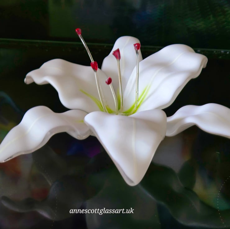 This handmade fused glass lily was one of 56 I made for my end-of-degree show for my BA(HONS) in glass at the University of Sunderland based at the National Glass Centre. Just over half of these were wafer-thin and unable to be sold due to being very fragile; the remainder were more robust. I made some of these in threes, but the finished lilies may be similar. However, they were never identical due to the nature of fused glass. But some were one-of-a-kind pieces. They were made using sheet glass, such as transparent or opaline, by hand cutting them into petal shapes, and details were added with glass powders. Due to the size of my kiln, I fired only one lily at a time. And each one took four firings to add the ail and shape. Stamens were made for each lily from glass stringers and small transparent glass pieces. Each one assembled and then slumped into shape. These were then glued into the centre for added detail. Then, each has a wall mount fitting glued to the back for displaying on a wall. Each lily measures approximately 25cm x25cm x 9cm and is in a handmade box for easy transportation and with its certificate of authenticity.