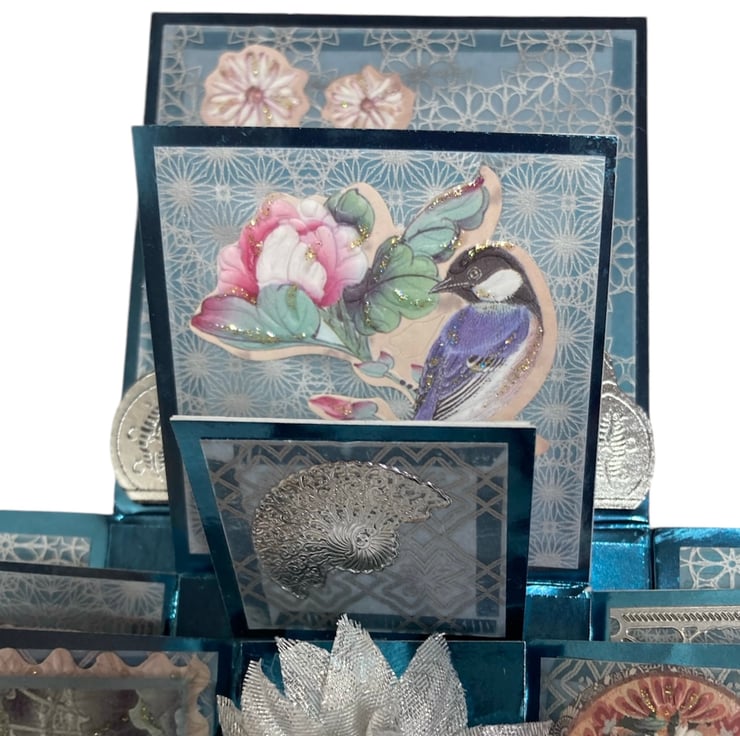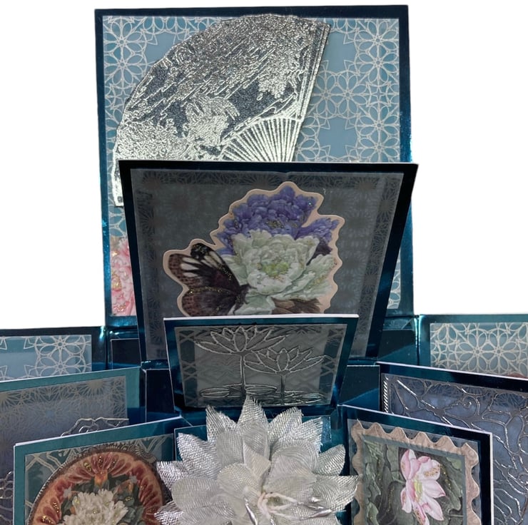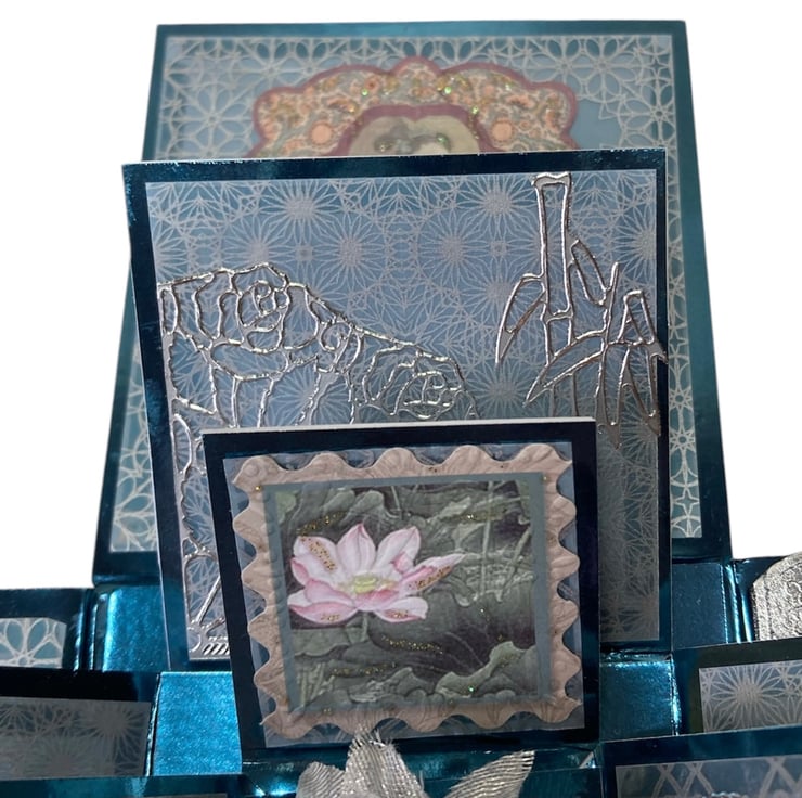 The layers inside the box have been layered with sapphire mirror card and silver foiled acetate. Embossed and die cut images typical of Japanese culture and style have been added throughout the box.