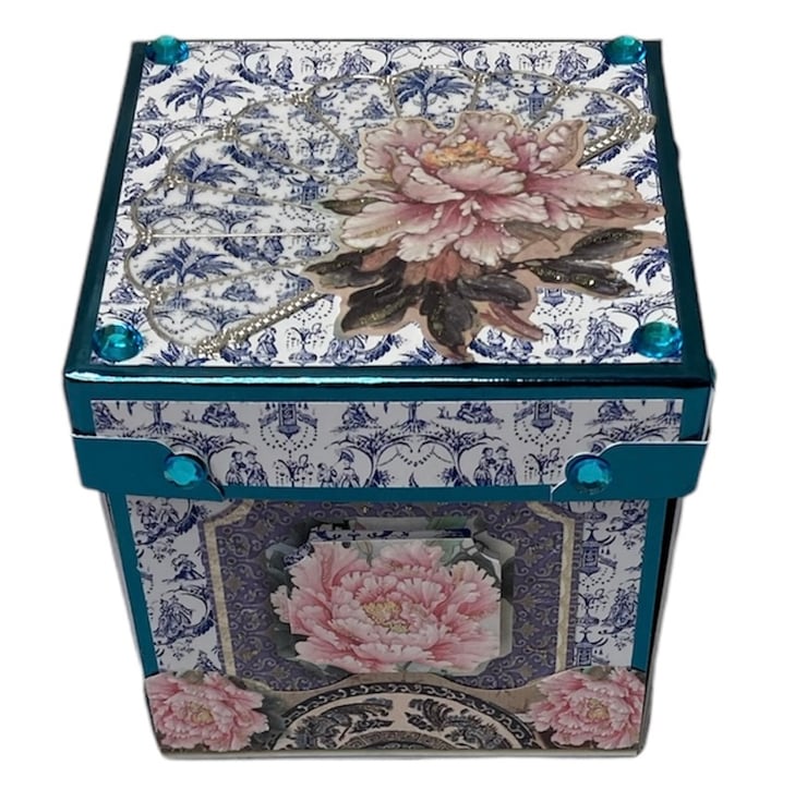 The outside of this box card has been decorated with sapphire mirror card overlaid with blue and white paper featuring a Japanese design. The front has been decorated with a pink floral design which is followed through onto the lid. The lid has been decorated with blue gems.