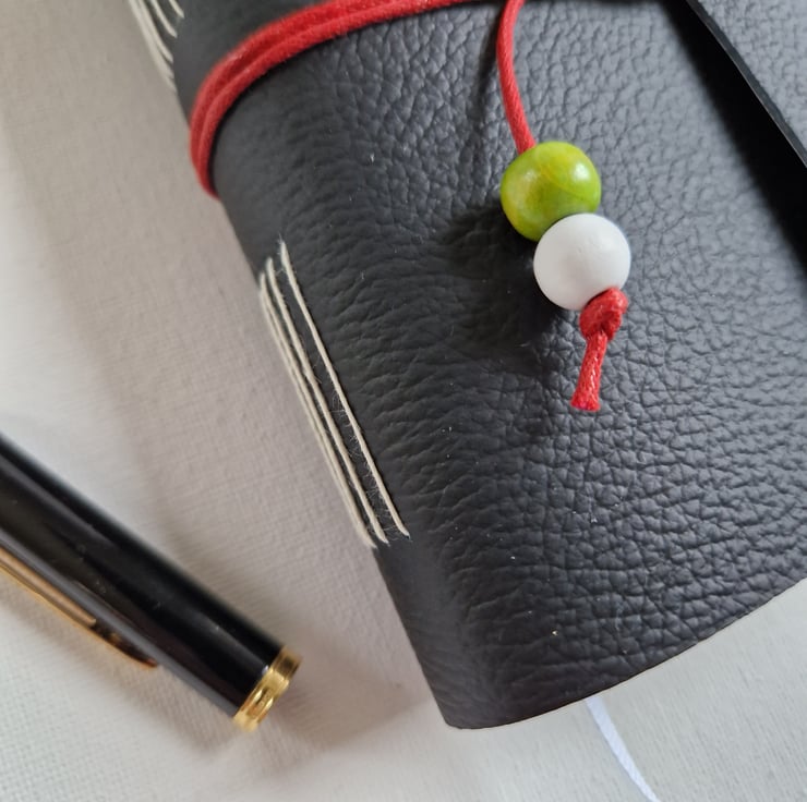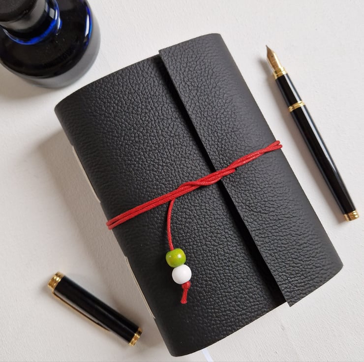 A5 or A6 size Hand Bound in black leather with 140 pages of 170gsm Cartridge Paper, perfect for writing, drawing, light watercolour and ink, perfect for creativity. There is a handy Ribbon Page Marker and the Journal lies completely flat when in use.