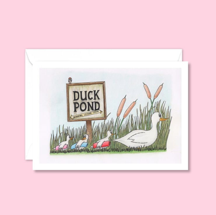 An original hand-drawn pencil illustration of a cute duck family on their way to the pond for swimming lessons. Ideal any occasion card for animal lovers.