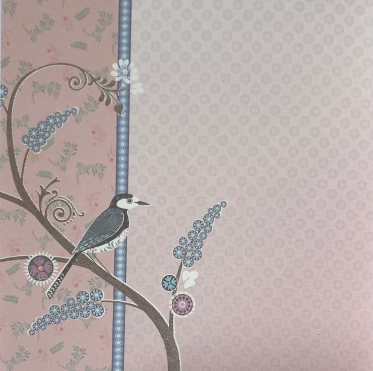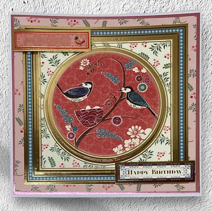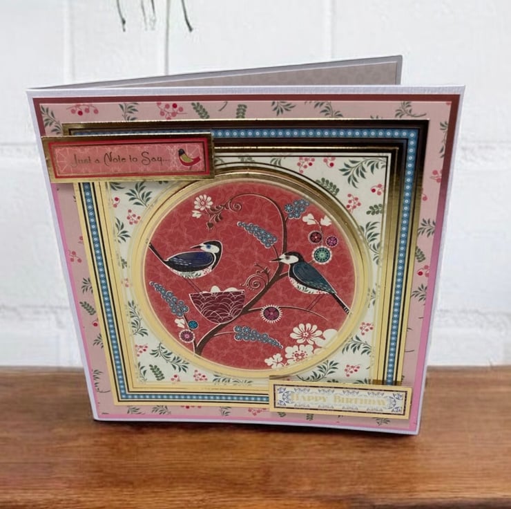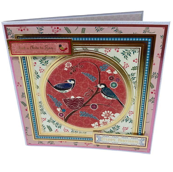 This birthday card has a white linen base which has been layered with pink mirror card and pink paper with leaves and berries. A large gold foiled topper featuring birds with a nest of eggs in a tree has been added in 3D. Two further toppers have been added with the words Just a Note to Say and Happy Birthday.